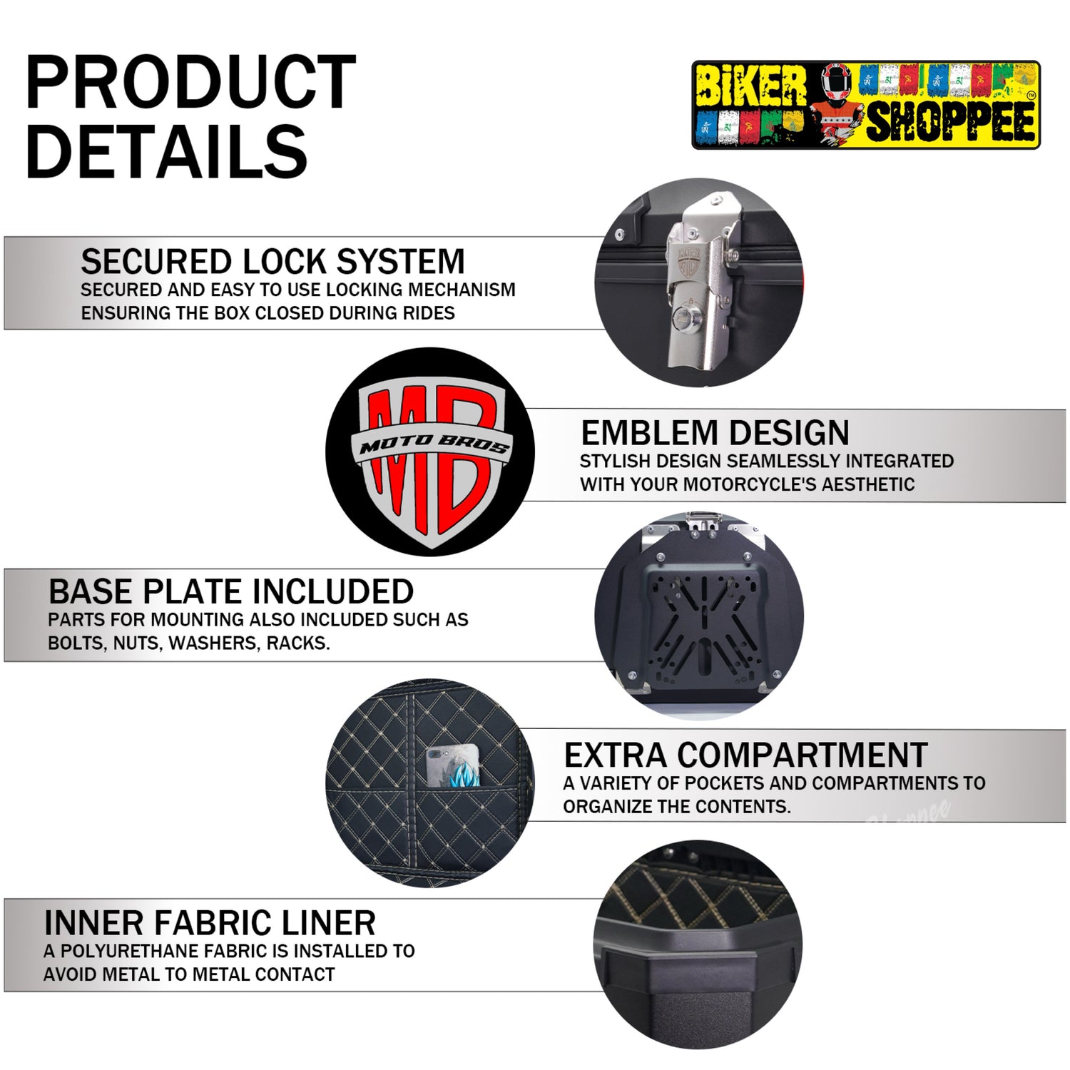 Upgrade your motorcycle's storage with the MOTO BROS Top Case 28 LTR Premium, combined, exclusively available at BIKER SHOPPEE. This premium a perfect blend of style and functionality, providing secure and stylish storage for your motorcycle adventures. the perfect choice for riders seeking a stylish and functional storage solution for their motorcycle. Upgrade your bike with this ALLOY 28L TOP BOX, providing ample space and a sophisticated look for your essentials on every ride.
