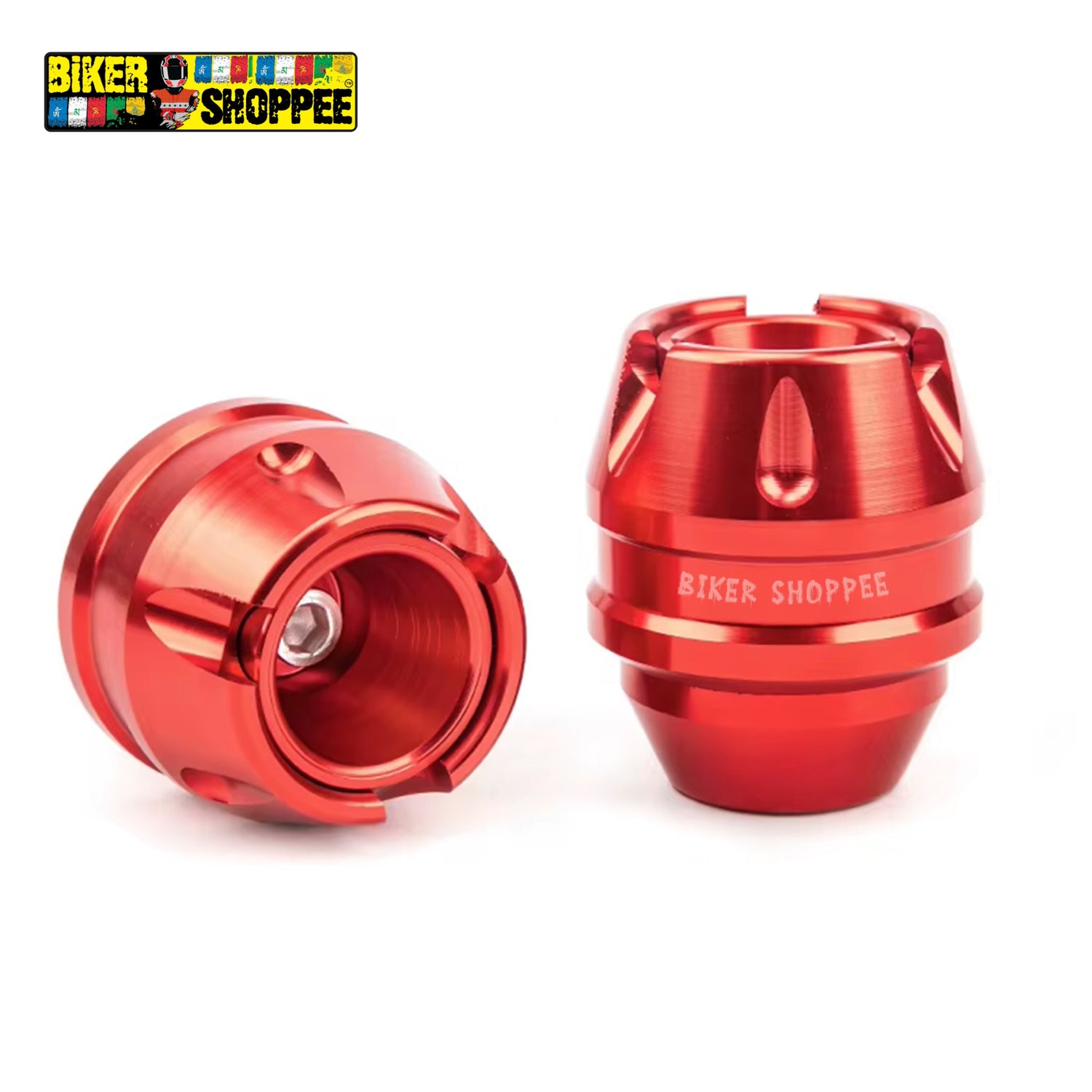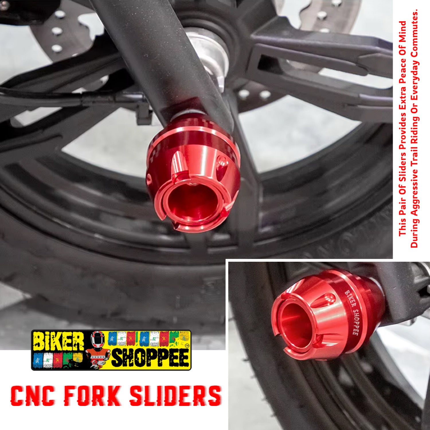 The Front Wheel Fork Slider available at BiKER SHOPPEE is a sleek and sturdy accessory designed to bolster protection and style. The slider features a CNC-machined aluminum core with a contrasting matte black cap that attaches securely to your fork axle ensuring a firm fit with no wobble or rattle. In the event of a low-side fall, these sliders act as sacrificial protectors, deflecting impact away from your fork lowers, brake calipers, and lines. Their compact, engineered profile maintains ground clearance and complements the All Type of Motorcycle styling, while the aluminum construction resists corrosion and adds minimal weight. this pair of sliders provides extra peace of mind during aggressive trail riding or everyday commutes.