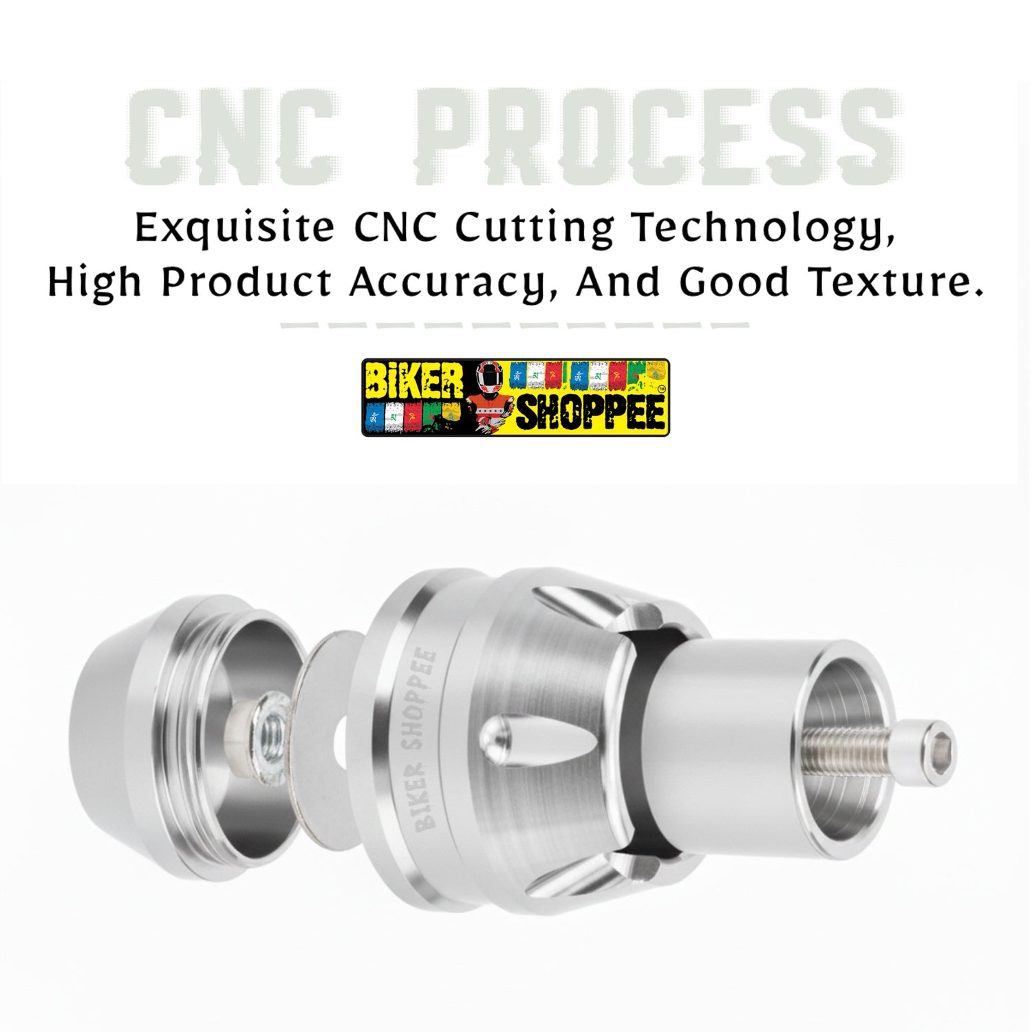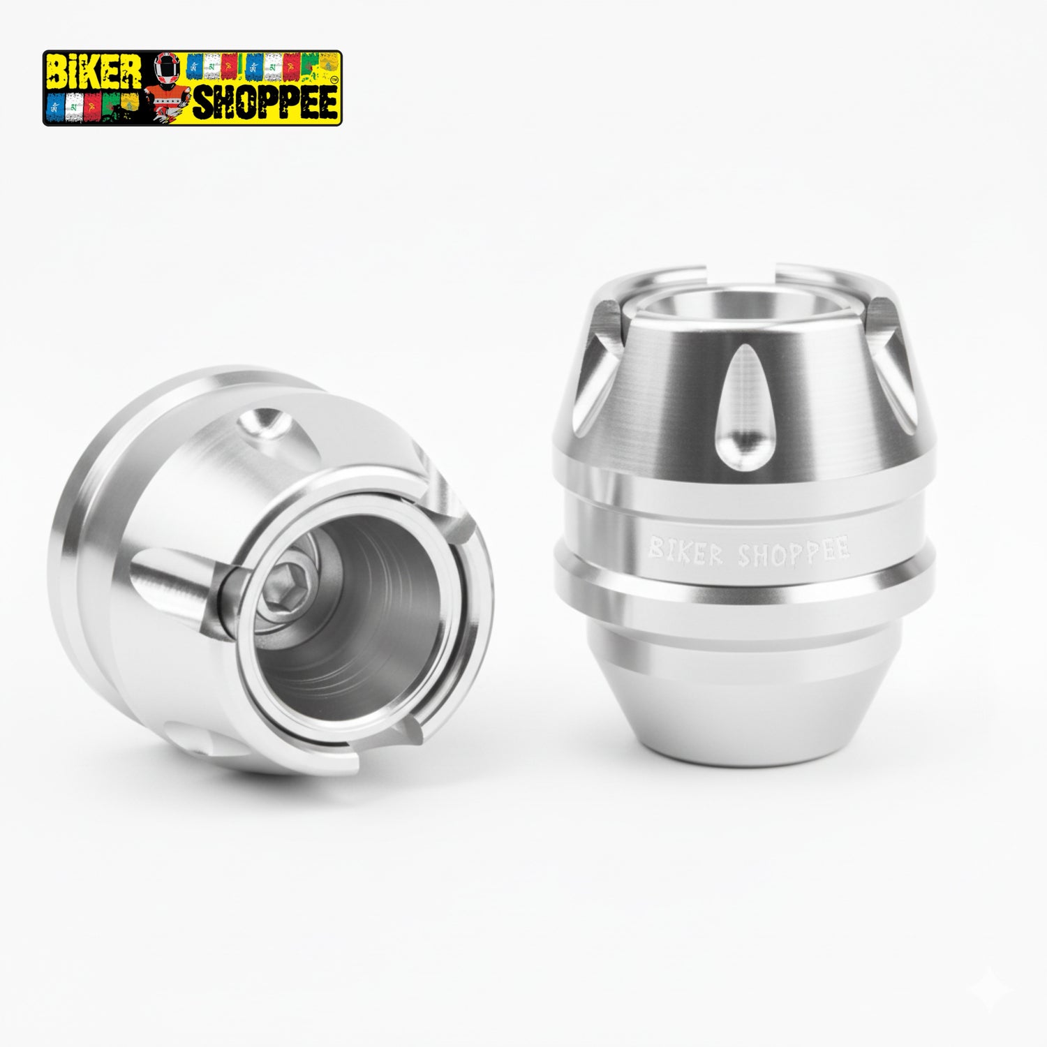 The Front Wheel Fork Slider available at BiKER SHOPPEE is a sleek and sturdy accessory designed to bolster protection and style. The slider features a CNC-machined aluminum core with a contrasting matte black cap that attaches securely to your fork axle ensuring a firm fit with no wobble or rattle. In the event of a low-side fall, these sliders act as sacrificial protectors, deflecting impact away from your fork lowers, brake calipers, and lines. Their compact, engineered profile maintains ground clearance and complements the All Type of Motorcycle styling, while the aluminum construction resists corrosion and adds minimal weight. this pair of sliders provides extra peace of mind during aggressive trail riding or everyday commutes.