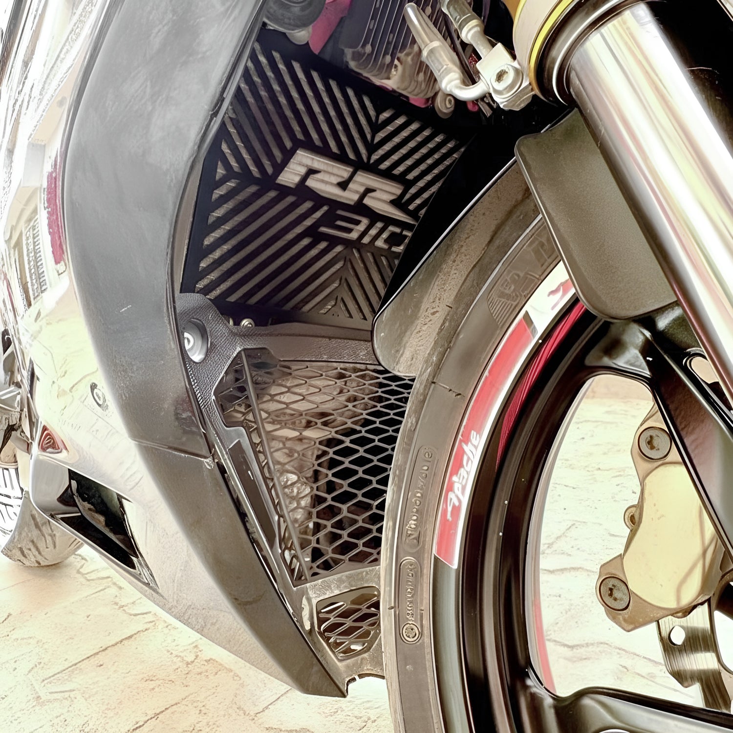 Style and protection meet in our radiator grill. With CNC machined steel body and a metallic finish, our radiator grill is designed specifically for your APACHE RR310. available at BiKER SHOPPEE Protect your bike’s radiator from damage as you zoom past on a highway with our new grill. However, don’t give up on the style quotient of your two-wheeler; we have you covered with a sleek design. A radiator grill can keep it protected from flying debris. The product featured here is made with mild steel. available at BiKER SHOPPEE.